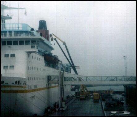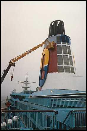 M/s Visby byter "G" i skorstenen infor chartern till N&T Gotlandslinjen den 1 januari 1988.