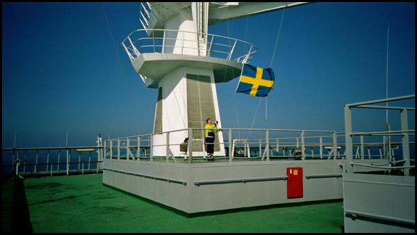 Morgan Ekedahl halade flaggan i masten inför ankomsten till Oskarshamn.