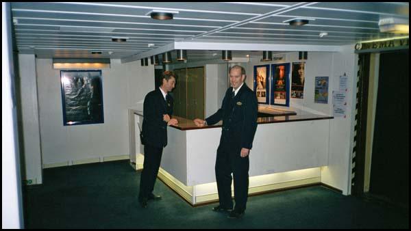 Här står Gert Jakobsson och Thomaz Westlund utanför biografen där de just har släppt in de passagerare som vill se på film under resan. © Foto: Stefan Andersson
