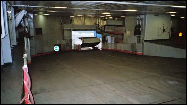 När man ska köra upp bilar till däck 5 genom den förliga bogporten så sänker man nerfrämre delen av däcket och fäller ut rampen som syns längst fram på bilden. © Foto: Stefan Andersson