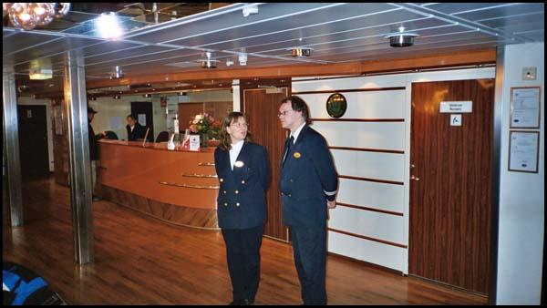 Här vid landgången står Intendent Carin Hammerin och Husfru Peter Doolkoch tar emot passagerare som är på väg ombord. © Foto: Stefan Andersson